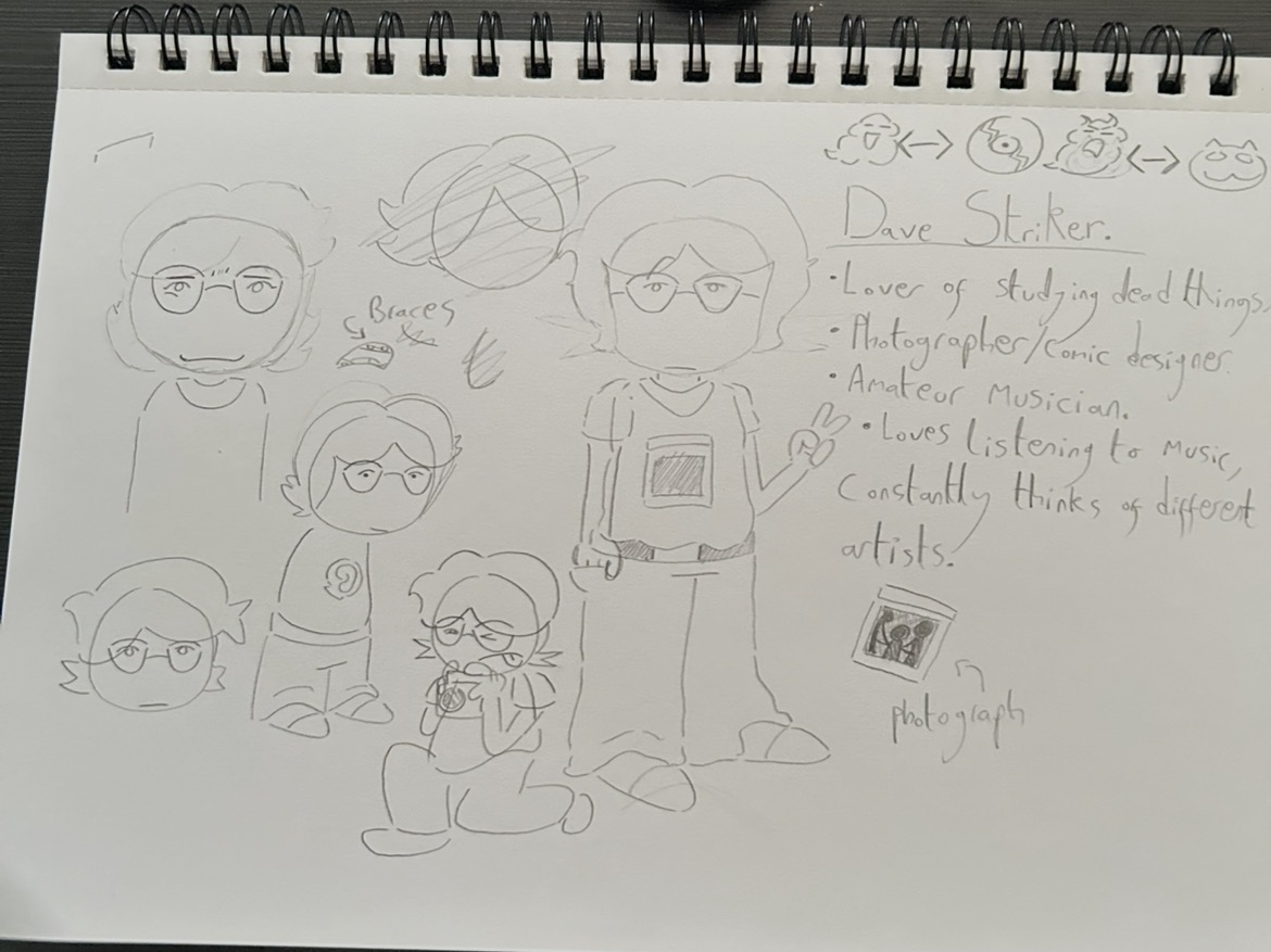 This is Dave Striker!! He’s a junior Taphonomist/Palaeontologist, as well as a decent photographer!! He likes music, but isn’t very good at producing it, and he usually engages in awkward musical encounters with his elder brother! He has posters of different bands nobody’s ever heard of in his room, and idolises each and every niche pick that his friends just don’t understand!!
