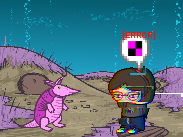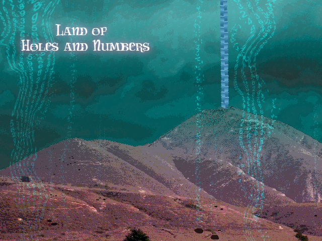 The landscape is very much rolling hills and canyons with a mix of grassy plains and dirt gulches, sometimes with winding rivers. The main thing however are the countless holes dotted everywhere, easy to accidentally fall into, if they aren't spraying out tons of raw numbers. These raw numbers gather in a layer high above and around the land, known as the numerosphere. It supposedly protects the land from various glitches and bugs and errors that have accumulated in the sbargv2 incipisphere. The numbers can also become embedded in various substances, as the very rocks and dirt and water have the numbers visible in them as well. If the collide with computing devices, they tend to show up on screen somehow.