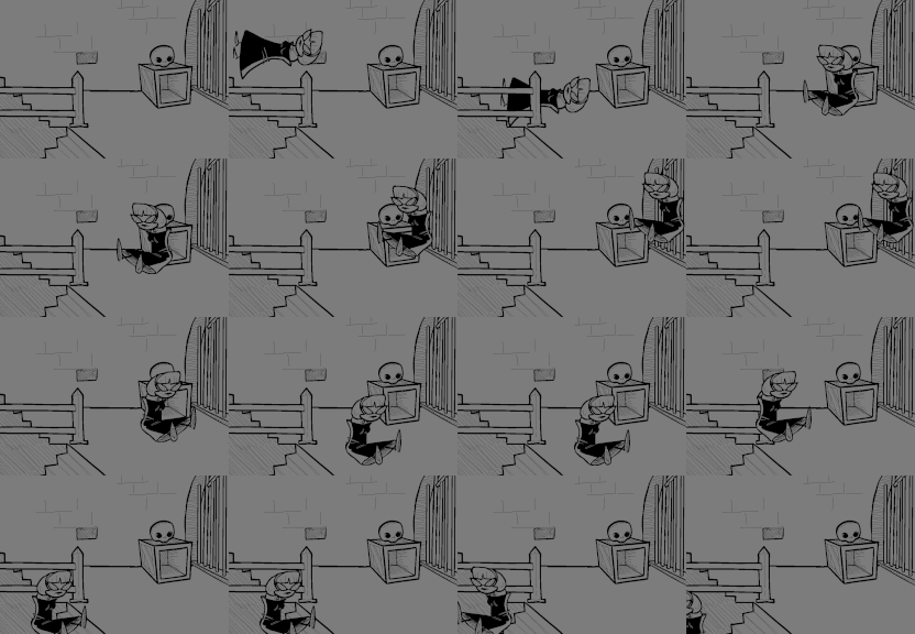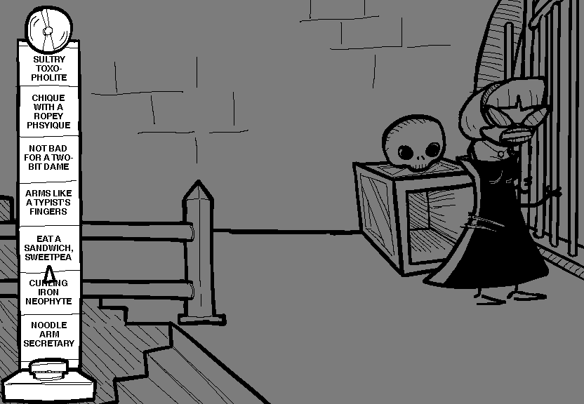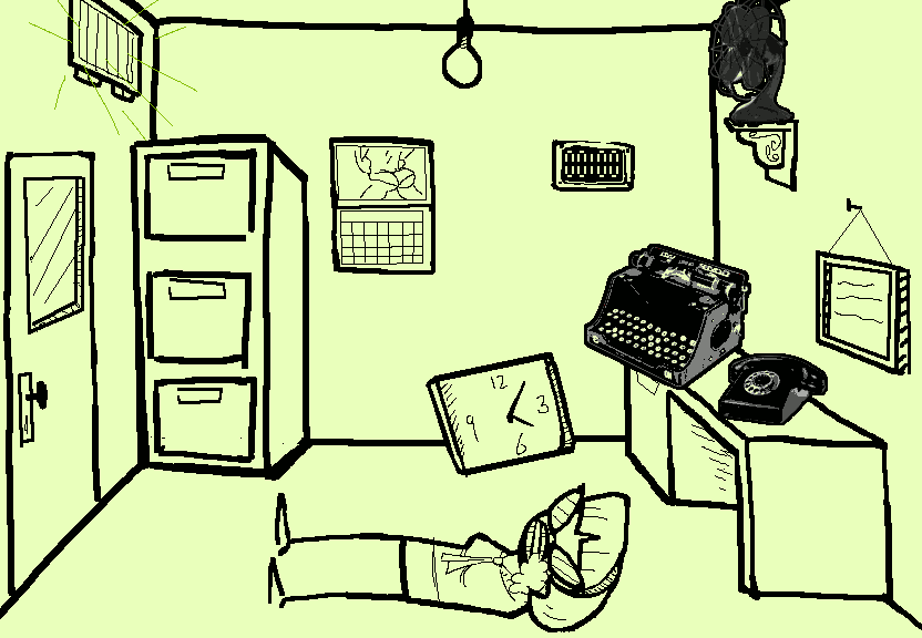 You are the building's SCATTY TYPIST, and boy are you hungry. You've been in the office for all of five minutes and you've worked up a wicked appetite. You reckon it's about time for your break.