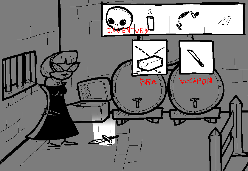 Inside is your old inventory! You (re)collect the hand drill and card. The dirk is left on the floor because your WEAPON SLOT is filled.