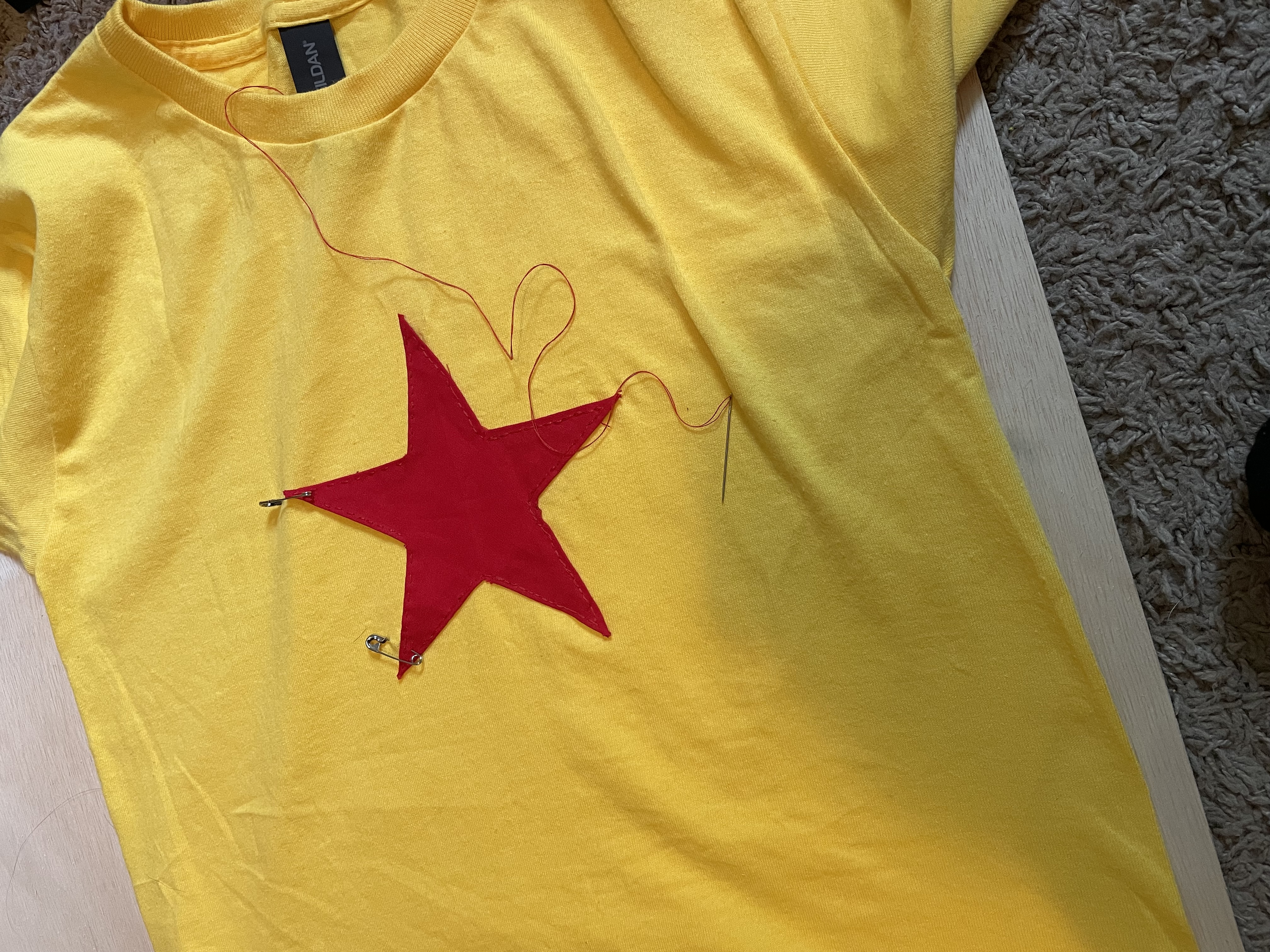 After I put the star, I am going to cut the rest of the red fabric into strips and put them along the hems of the shirt.