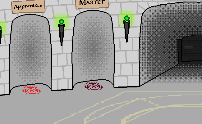 Two sections of said wall are recessed, serving as teleportation spots for travelling to the APPRENTICE's room and one to the MASTER's room.