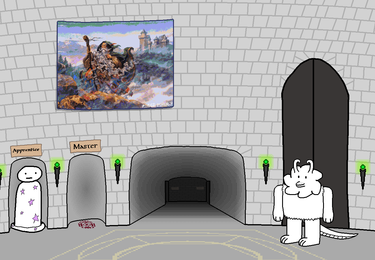 Above the APPRENTICE's head hangs an immense wizard tapestry. Depicted is a travelling ARCHMAGE, one of the APPRENTICE's MASTER's MASTER's MASTERS, long since passed.