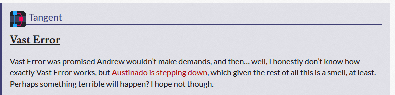 One exceptionally glaring one is his comment about vast error and austin which austin DIRECTLY refutes on his twitter and bluesky